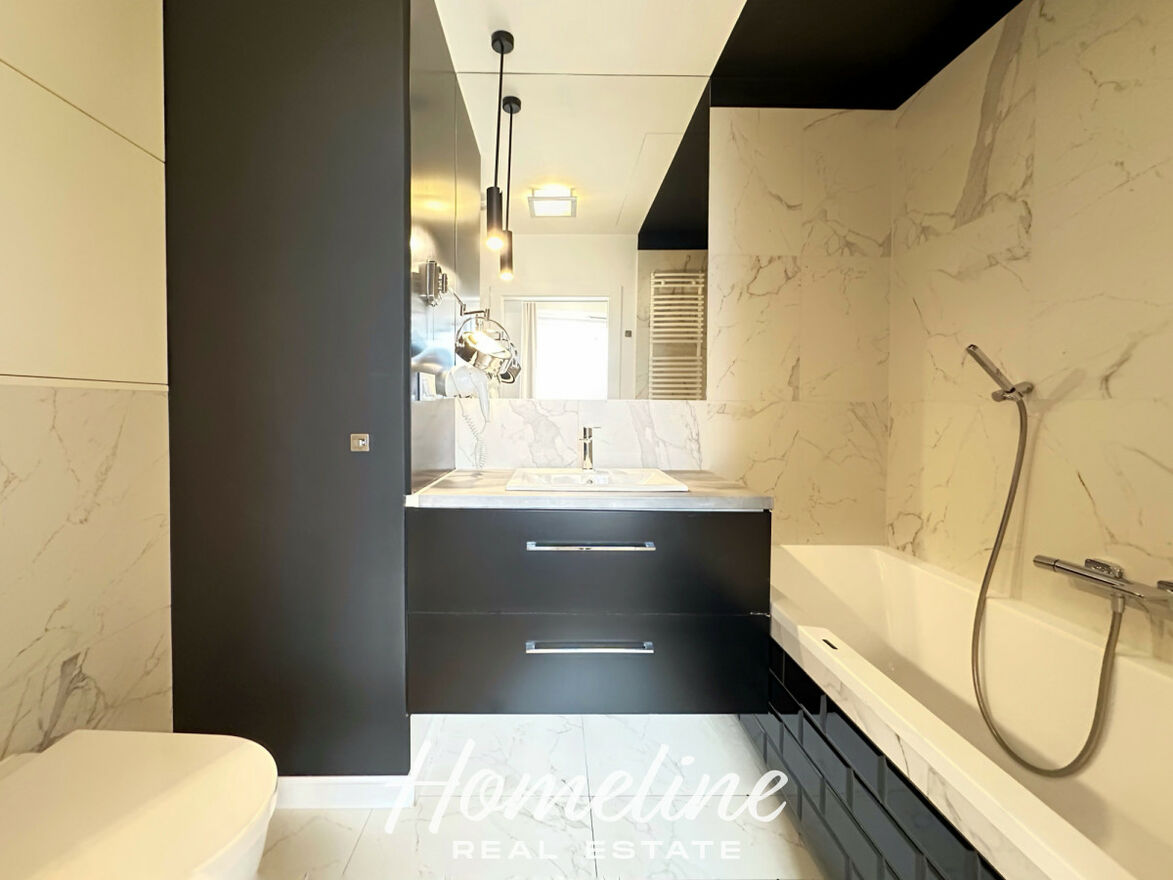 Dwie nowoczesne łazienki - jedna wyposażona w wannę, druga w przestronny prysznic.