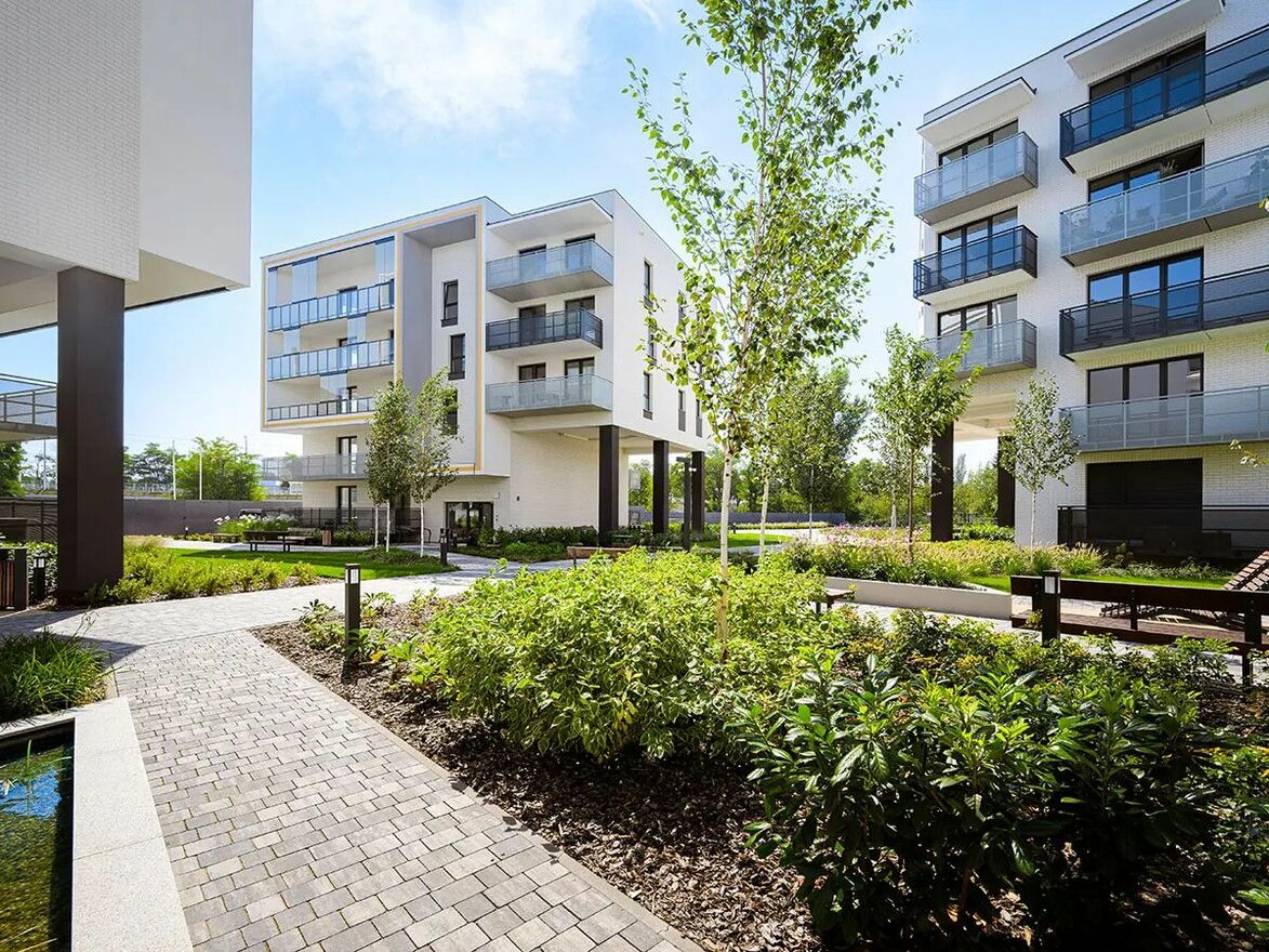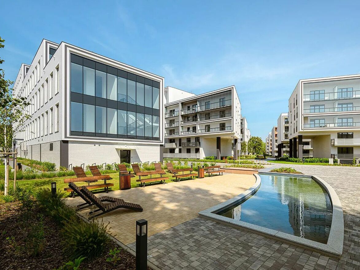 - Starannie zagospodarowany teren obejmuje zieleń, alejki spacerowe, oczka wodne oraz strefy relaksu sprzyjające codziennemu komfortowi mieszkańców.