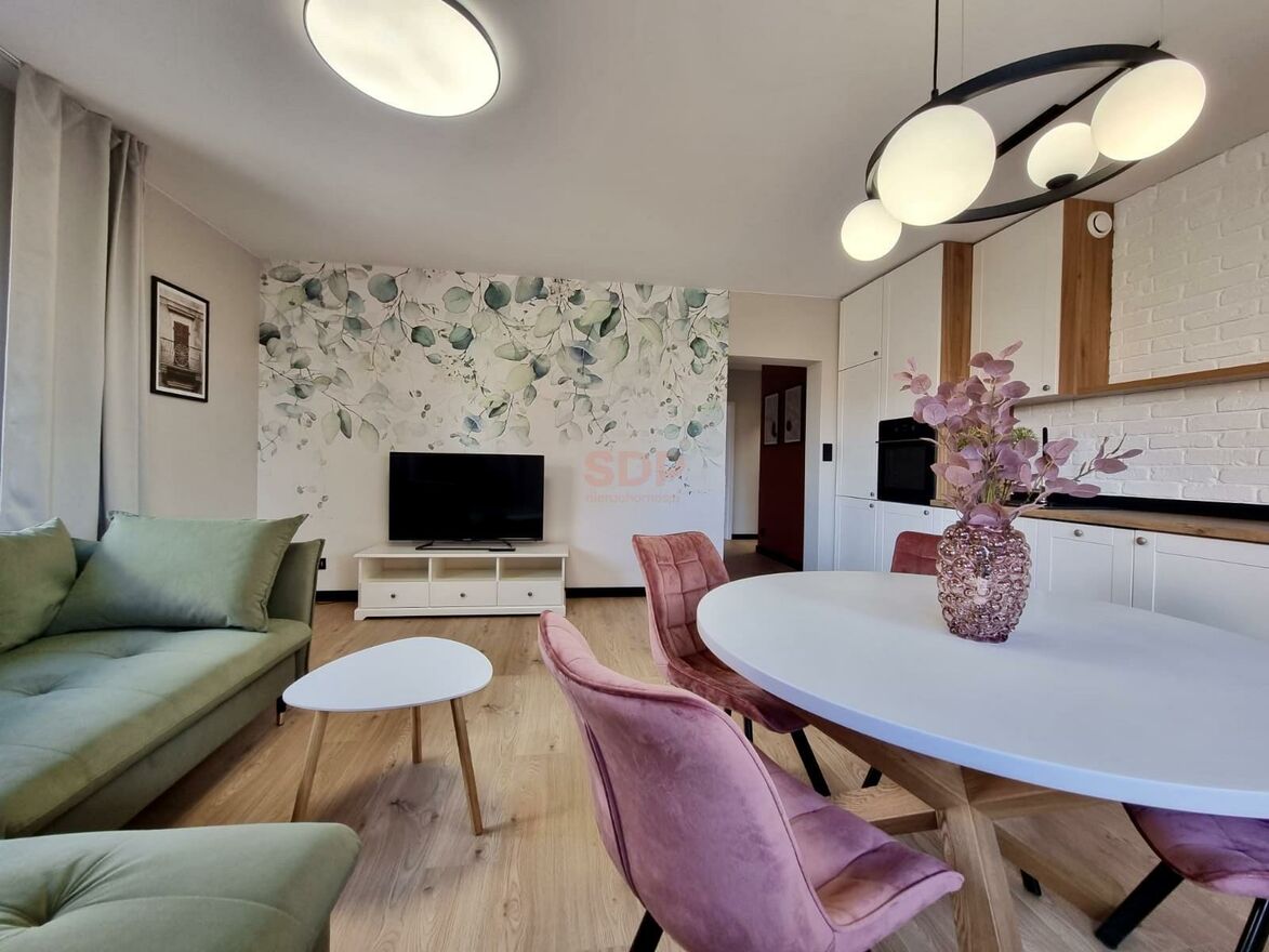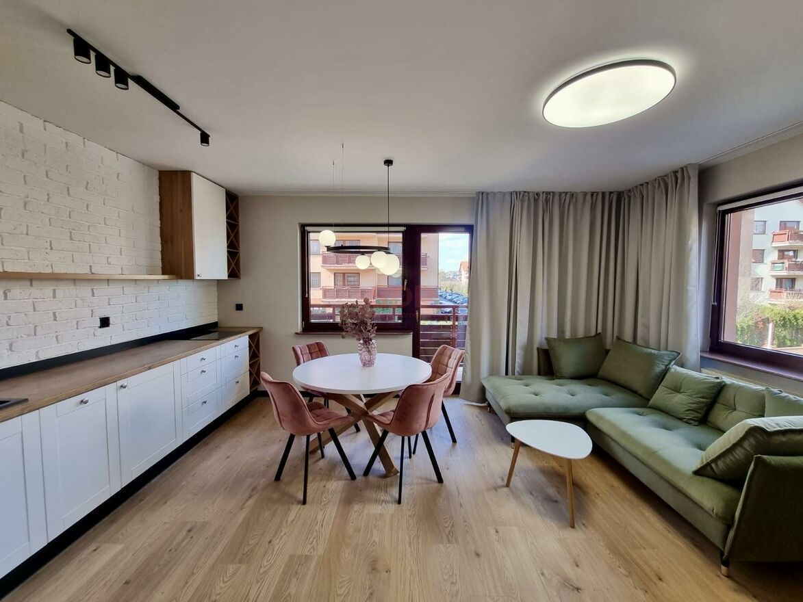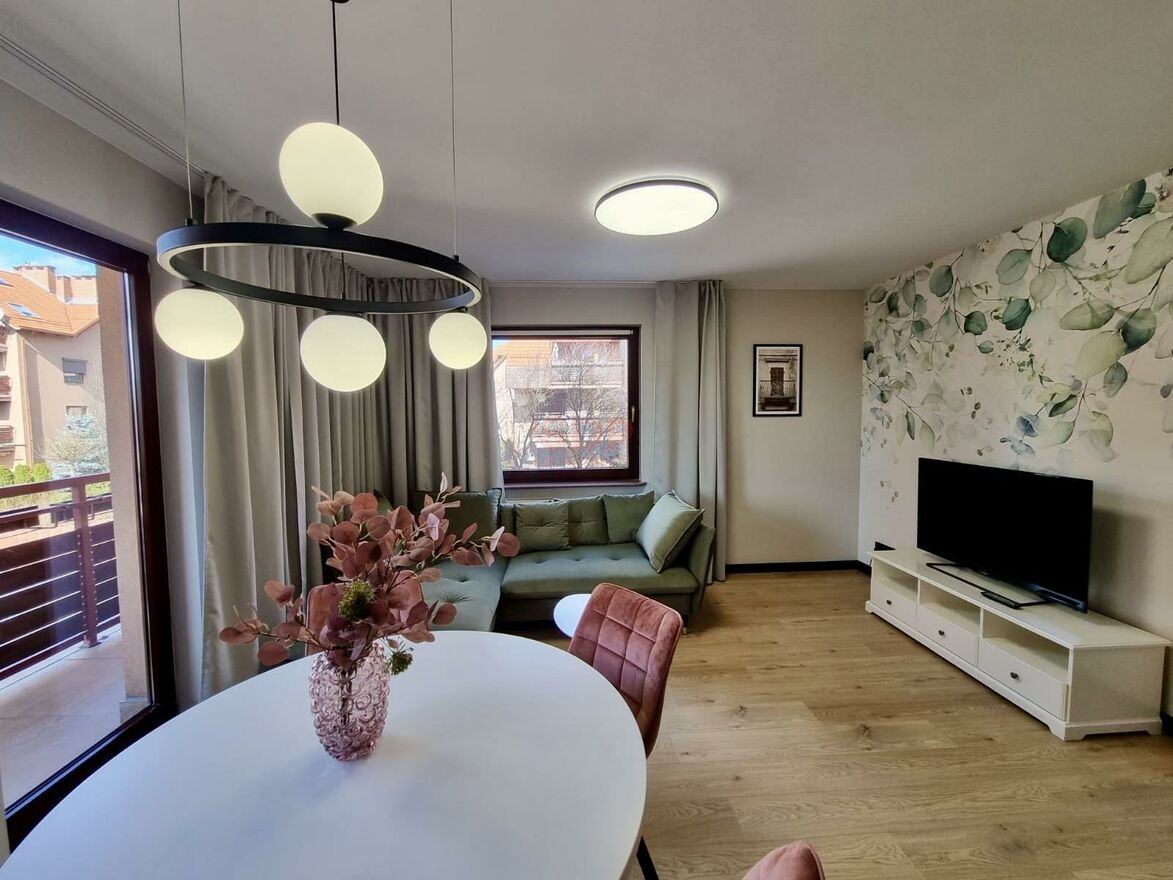 W salonie designerska rozkładana sofa, stolik kawowy, stół jadalniany z krzesłami. Z salonu wyjście na przestronny balkon. W części kuchennej zmywarka, lodówka z zamrażarką w zabudowie, piekarnik, płyta indukcyjna.