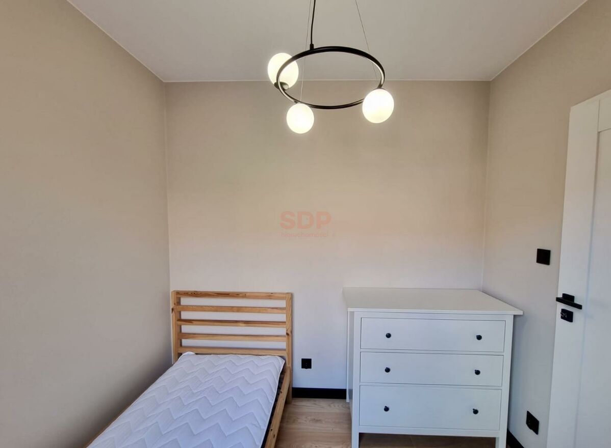 W trzecim pokoju jednoosobowe łóżko oraz komoda.