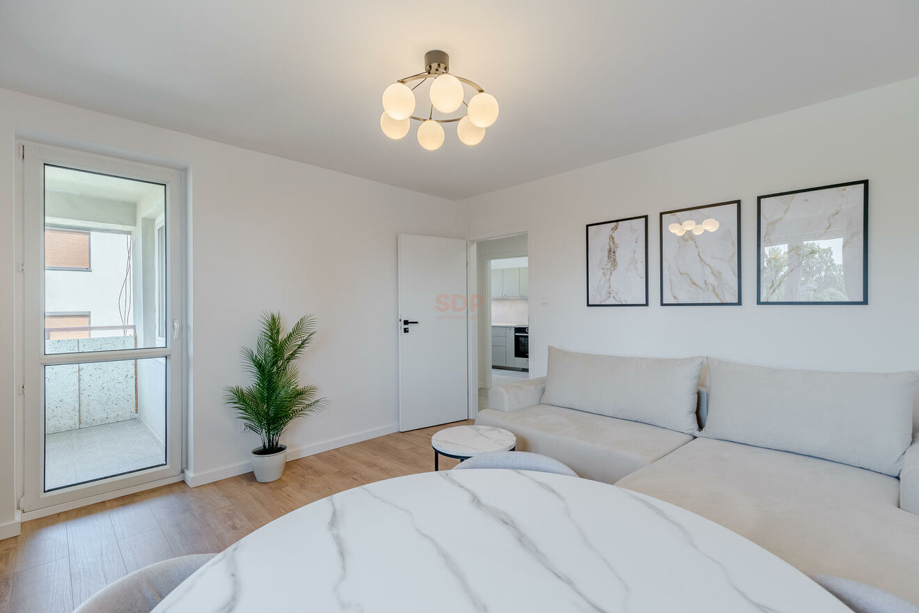 -Przestronny salon z rozkładaną kanapą oraz wyjściem na balkon,