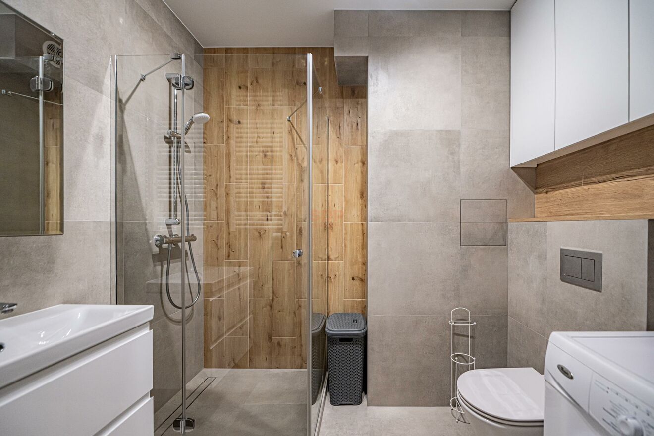 Mieszkanie składa się z trzech osobnych pokoi i kuchni z wysokiej klasy meblami, wykonanymi na zamówienie. Wszystkie sprzęty są nowe i na gwarancji. Na podłodze wysokiej klasy ścieralności panele. Możliwość doposażenia mieszkania według potrzeb najemcy (do ustalenia). W mieszkaniu znajdują się szafy wnękowe, klimatyzacja oraz rolety wewnętrzne.
