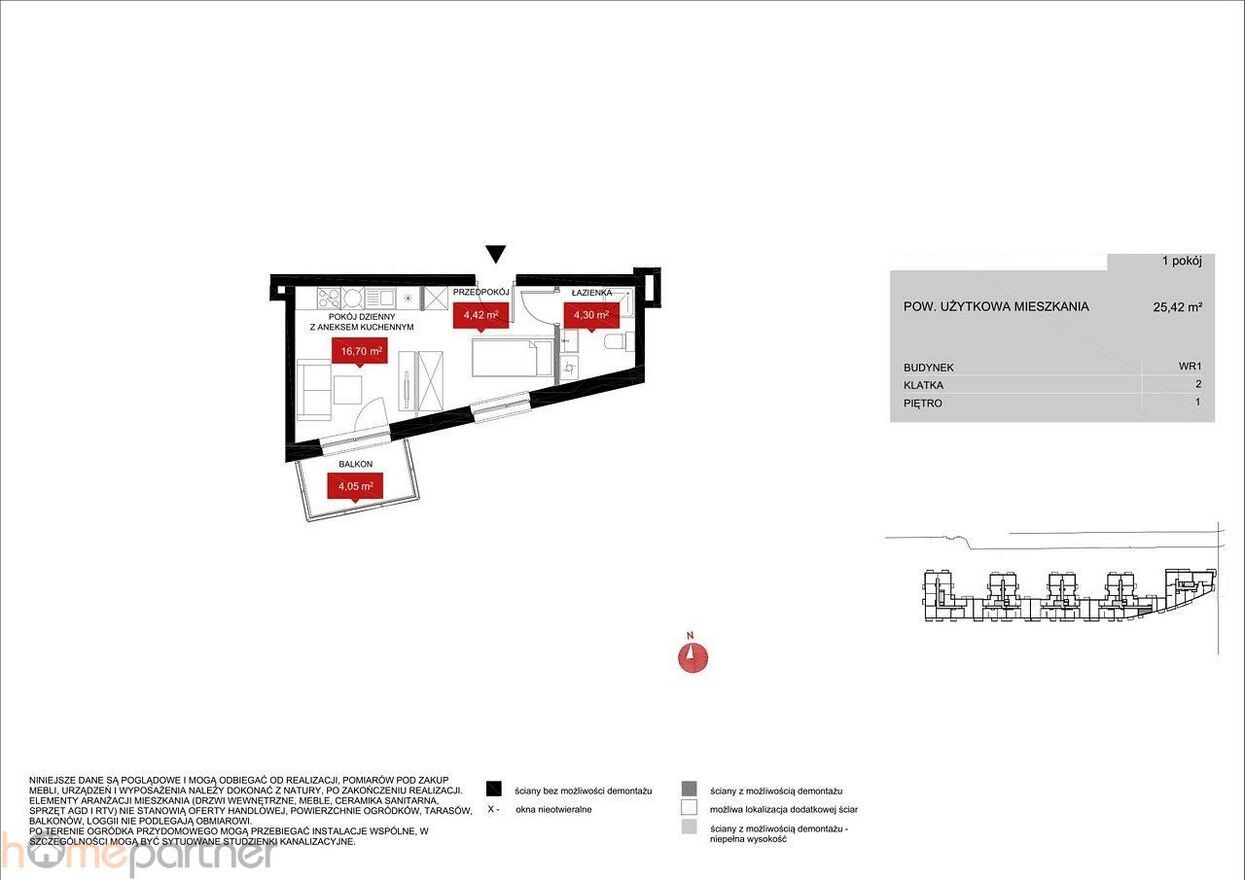 Mieszkanie o powierzchni 25,42 m, składa się z: