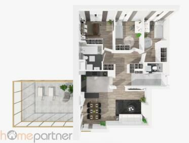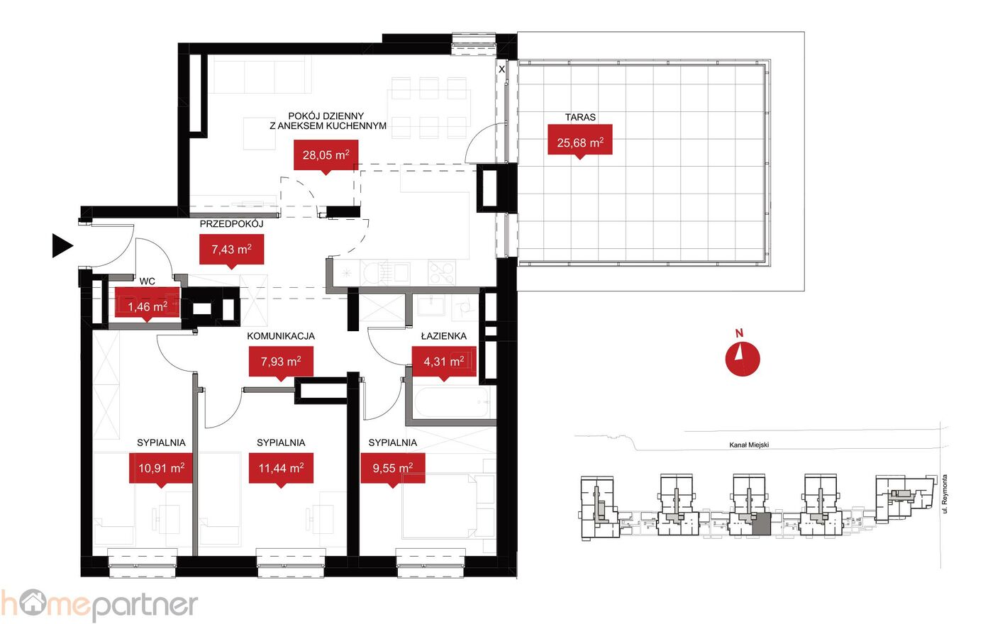 Do mieszkania przynależy taras z widokiem na rzekę o powierzchni po 25,68 m2