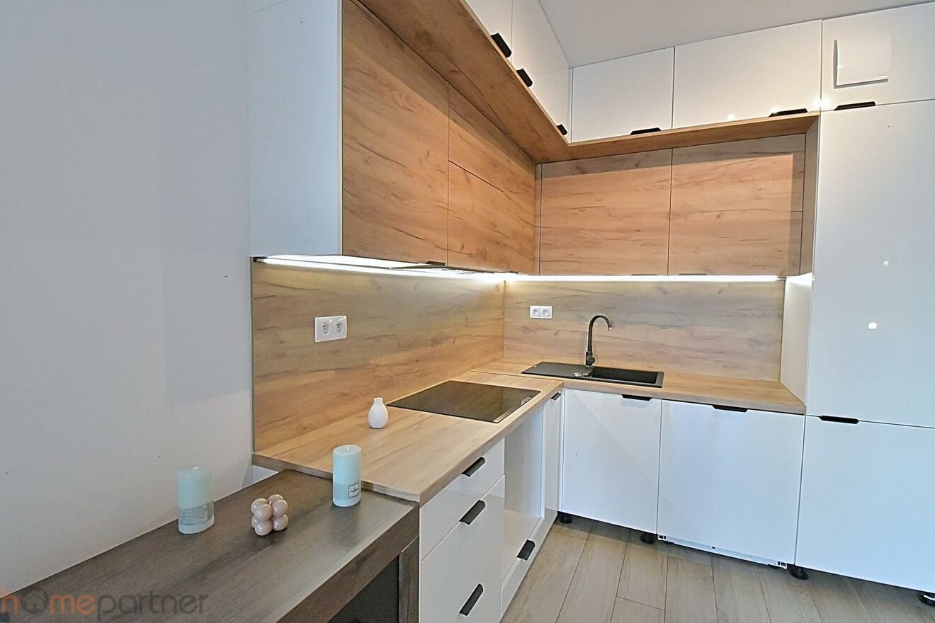 Kuchnia w zabudowie wyposażona w lodówko-zamrażarkę, płytę indukcyjną, piekarnik, okap i zmywarkę 60 cm.