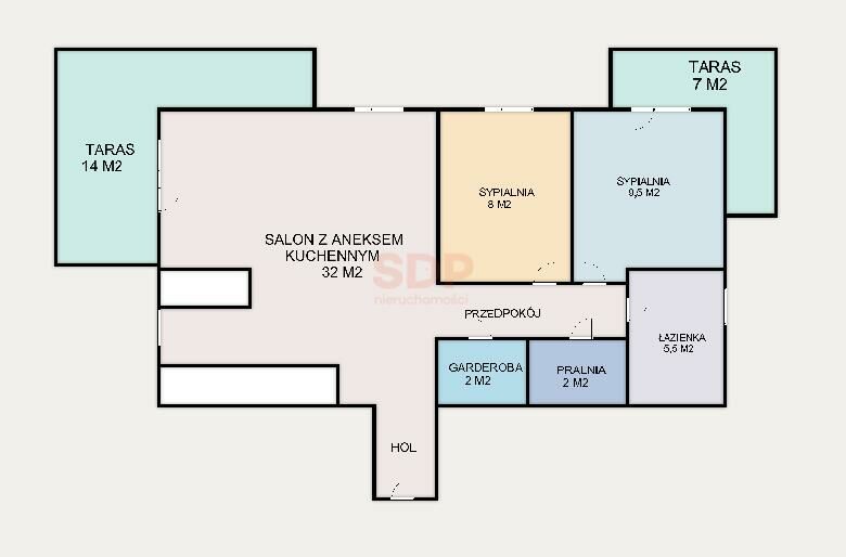 Układ pomieszczeń jest starannie przemyślany i funkcjonalny. Ogromny salon, 2 sypialnie, osobna garderoba, pralnia i dwa tarasy spełnią oczekiwania najbardziej wymagającej rodziny.