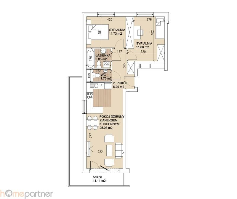 - pokoju dziennego z aneksem kuchennym 25,08 m2