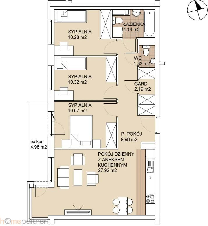- pokój dzienny z aneksem kuchennym 27,92 m2