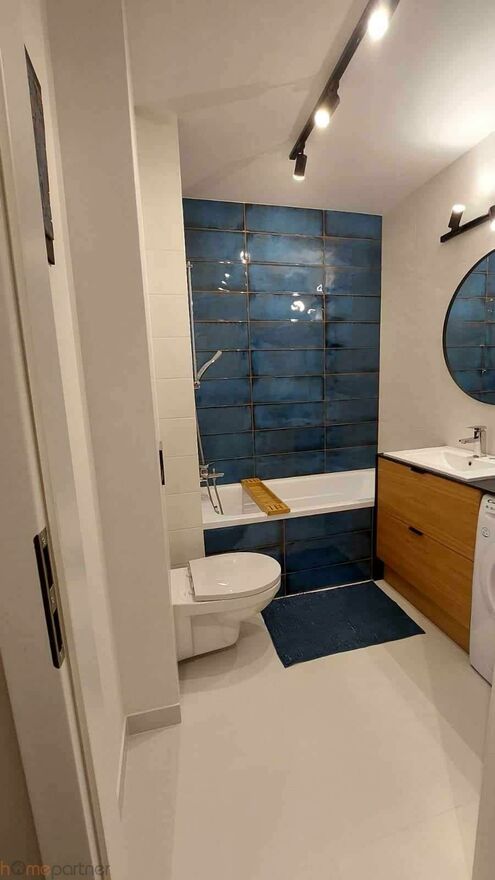 Mieszkanie jest umeblowane i wykończone materiałami wysokiej klasy. Kuchnia w zabudowie wyposażona w lodówko-zamrażarkę, płytę indukcyjną, piekarnik, okap, zmywarkę, mikrofalówkę. Łazienka z wanną, pralka na wyposażeniu. W sypialni łóżko małżeńskie, stoliki nocne i duża szafa. Salon kompletnie wyposażony: sofa (nierozkładana), szafka RTV, stolik kawowy, stół i krzesła.