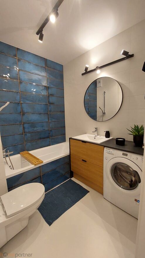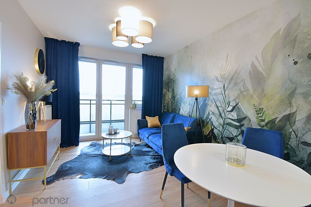 Mieszkanie jest umeblowane i wykończone materiałami wysokiej klasy. Kuchnia w zabudowie wyposażona w lodówko-zamrażarkę, płytę indukcyjną, piekarnik, okap, zmywarkę, mikrofalówkę. Łazienka z wanną, pralka na wyposażeniu. W sypialni łóżko małżeńskie, stoliki nocne i duża szafa. Salon kompletnie wyposażony: sofa (nierozkładana), szafka RTV, stolik kawowy, stół i krzesła.