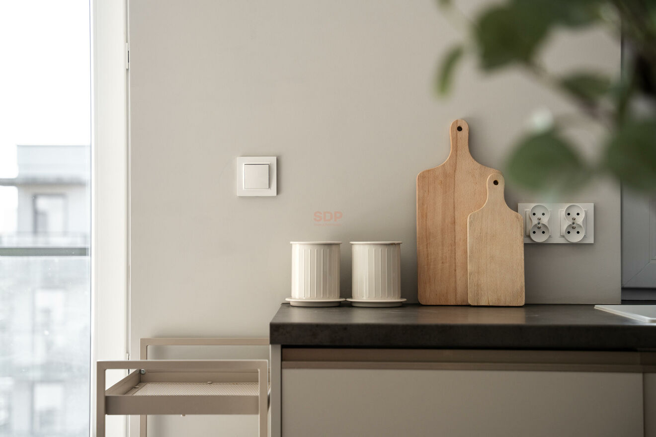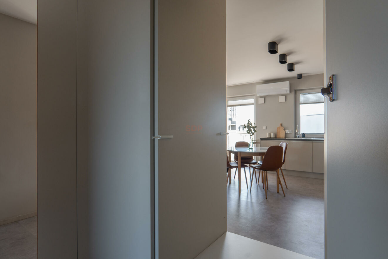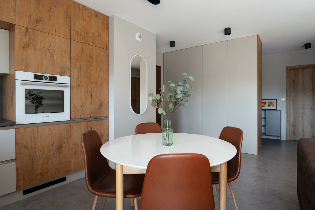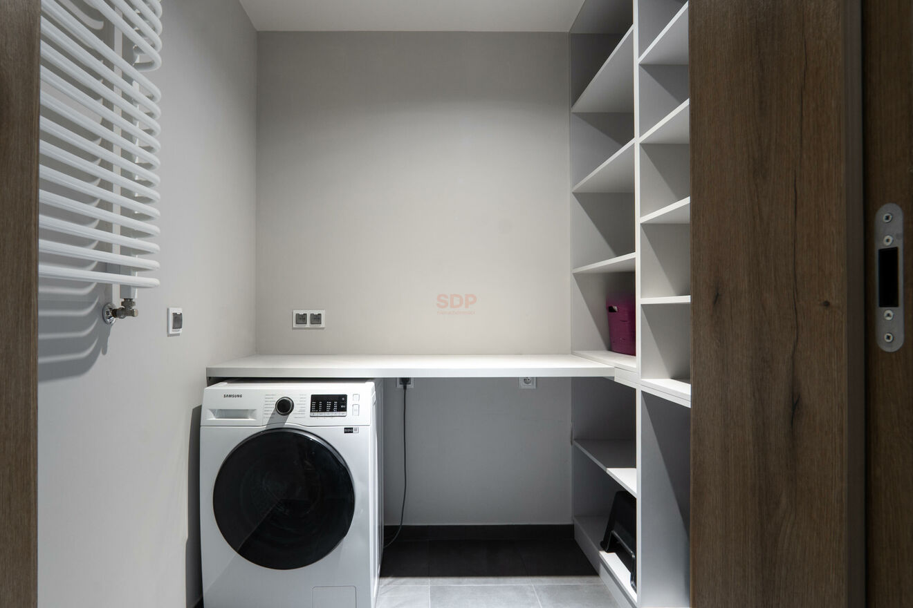 - Dużo miejsca do przechowywania, dzięki zastosowaniu mebli w zabudowie oraz dodatkowemu pomieszczeniu gospodarczemu/garderobie