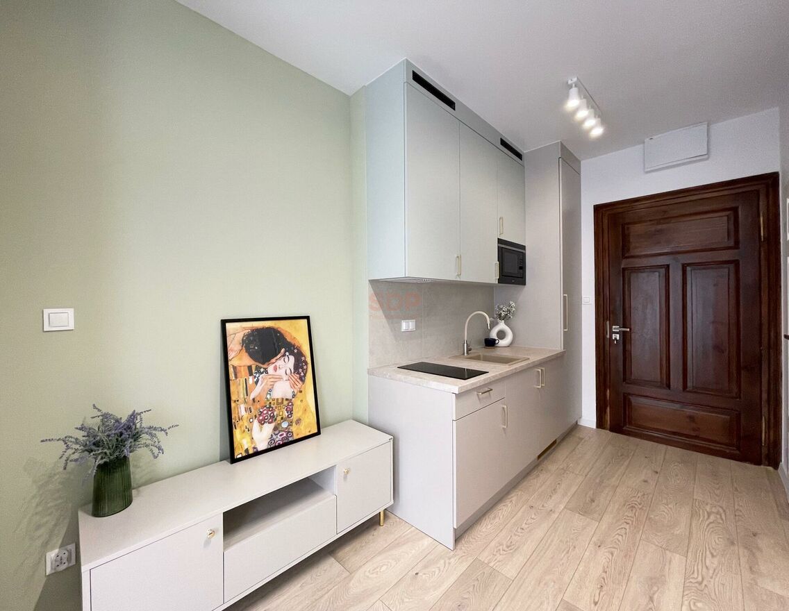 I Kawalerka:- salon z aneksem kuchennym, w tym wszystkie meble oraz zabudowa kuchenna z AGD: okap, płyta indukcyjna i lodówka, piekarnik