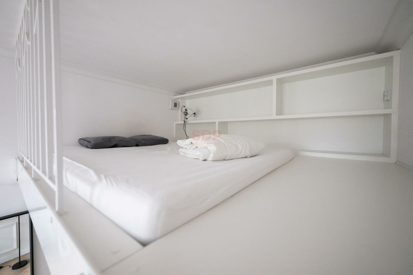 - Bedroom area; mezzanine - with a comfortable mattress, shelves, and a bedside lamp
