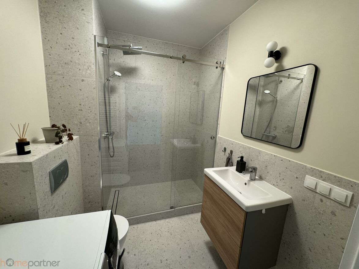 The apartment is furnished, modernly designed, and finished with high-quality materials. The built-in kitchen includes: fridge-freezer, induction, hob oven, coffee machine. The bathroom features a shower and a washer-dryer. The living area includes: a fold-out sofa with a built-in mattress (160 200 cm), table, TV cabinet, Smart TV.