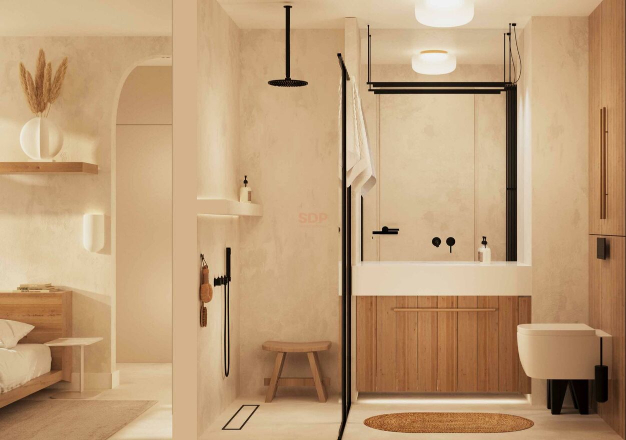 główna sypialnia (17 m) z garderobą i prywatną łazienką z prysznicem (3,7 m).