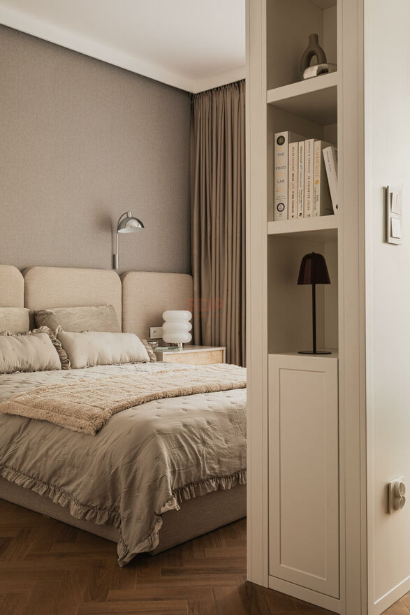 The apartment has underfloor heating and a swivel TV. The apartment is fully furnished. The built-in furniture was custom-made. The kitchen is fully equipped, including high-end appliances and a coffee machine. The countertops are made of NOBLE ARCO quartz conglomerate (kitchen and bathroom). The bathroom includes a clothes dryer. The apartment also includes an upright vacuum cleaner.
