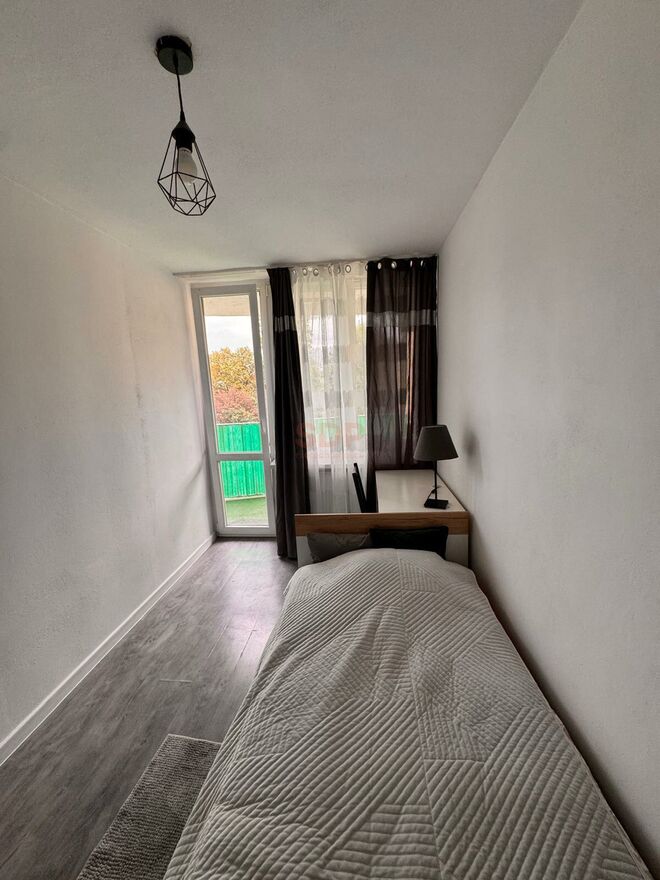 Mieszkanie 55m2 z pięcioma pokojami, balkonem, WC, łazienką i aneksem kuchennym.