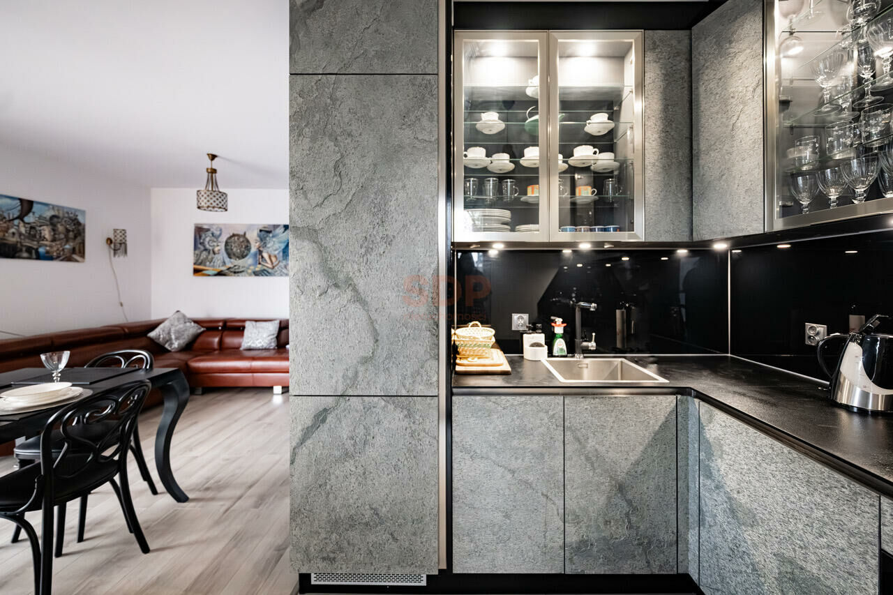 - Kuchnia wyposażona jest w wysokiej klasy sprzęty AGD (ekspres do kawy i spieniacz do mleka Nespresso, piekarnik, zmywarka, duża lodówka z zamrażarką) oraz meble na wymiar z frontem kamiennym (2mm) i szklanym fartuchem kuchennym. Dostępne również małe wyposażenie kuchni.