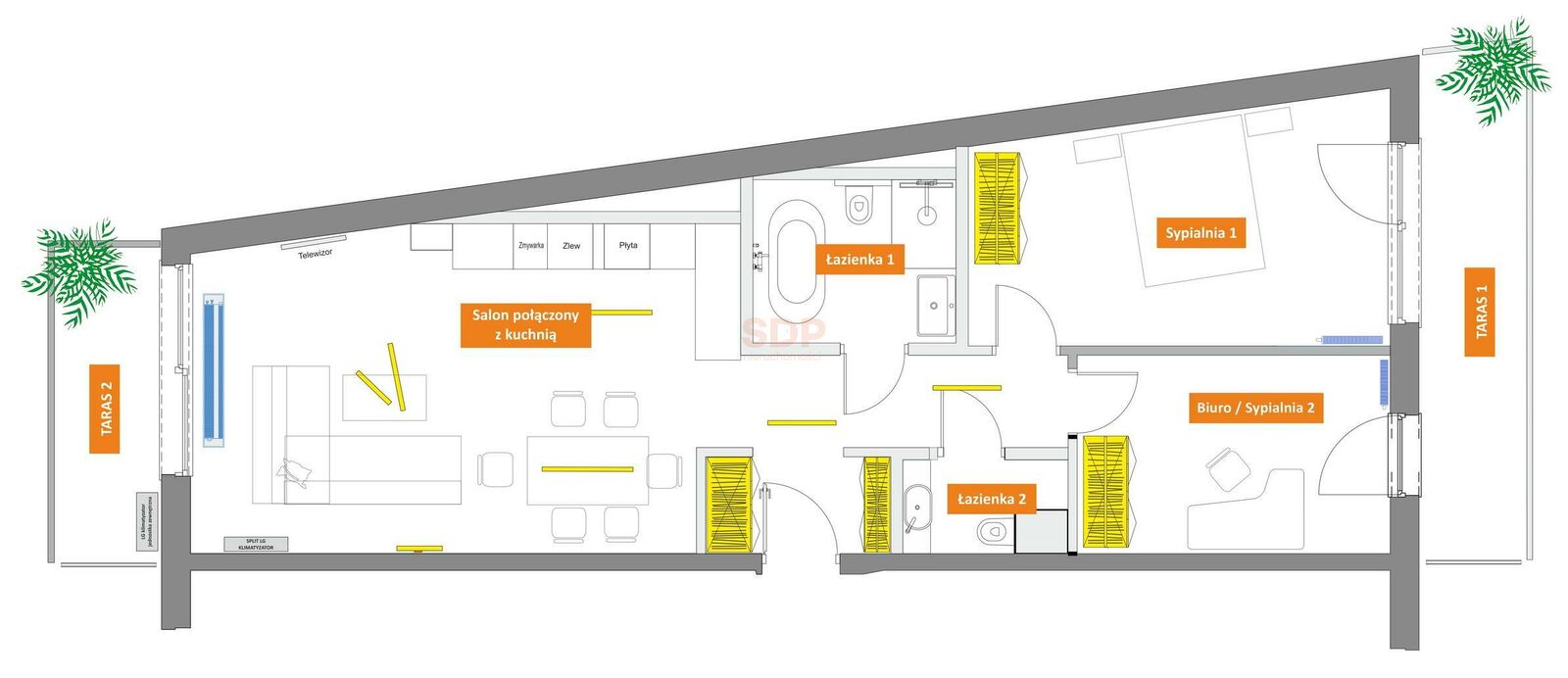The apartment consists of a living room with kitchen, two bedrooms one of them is furnished for an office without a bed, two bathrooms and a hall with two spacious wardrobes. All rooms are very well light, because of large balcony windows, which at the same time allow access to two terraces.
