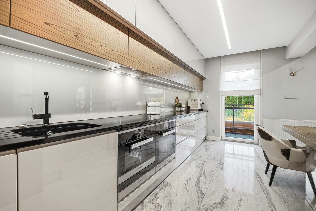 Półotwarta kuchnia wyposażona jest w meble na wymiar wraz ze sprzętami AGD renomowanych marek (lodówko-zamrażarka 2-way NO FROST Sharp, zmywarka 60cm, piekarnik i urządzenie do gotowania na parze MIELE, płyta indukcyjna i podwieszany okap), co zapewnia komfort użytkowania przez długie lata. Z kolei szklany panel ochronny, zamontowany na ścianie nad blatem gwarantuje czystość i porządek. Praktyczności dodaje tutaj niezniszczalny granitowy blat wraz z podwieszanym, granitowym zlewem.