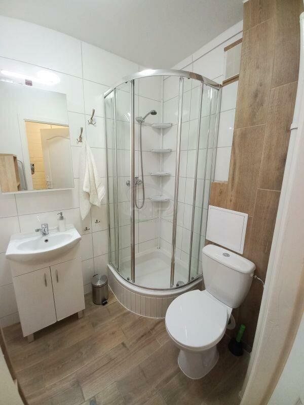 W łazience znajduje się kabina prysznicowa, toaleta oraz umywalka.