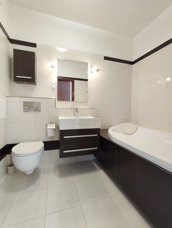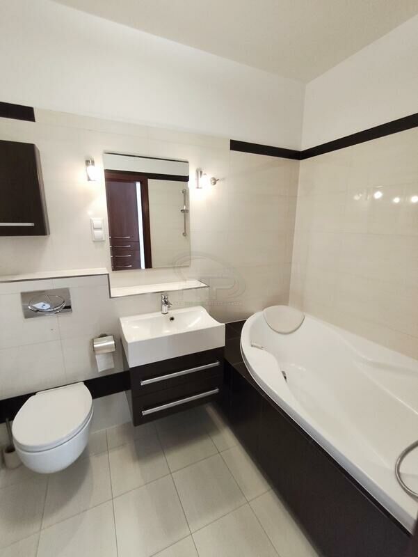 Łazienka z wanną, w.c., umywalką i pralką, w gustownych kaflach.