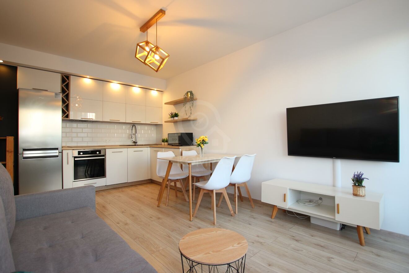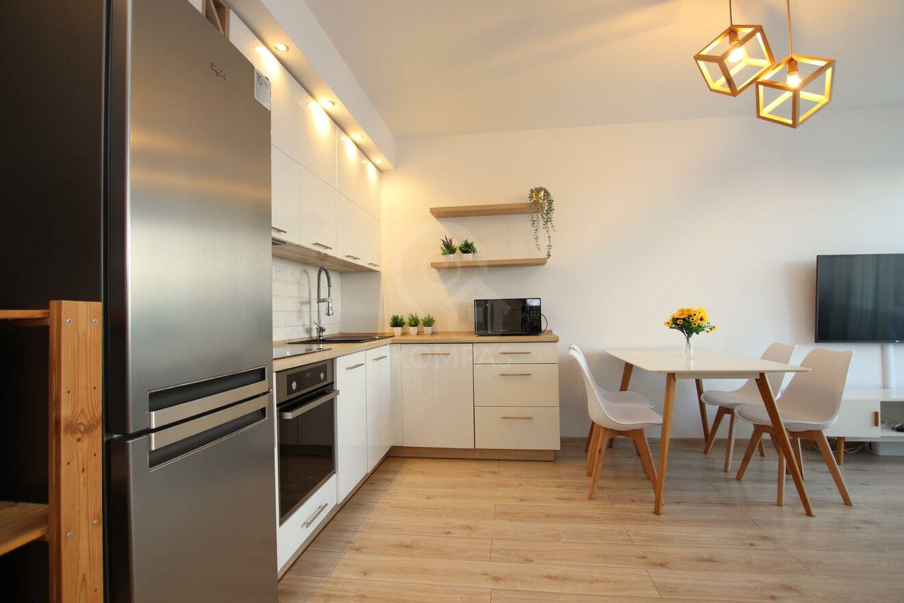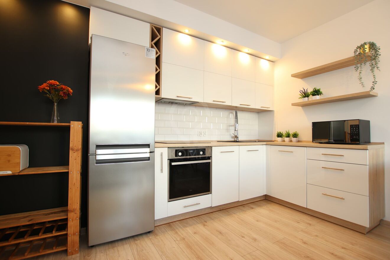Mieszkanie urzeka wyjątkową aranżacją i dbałością o detale. Gustownie urządzone wnętrze harmonijnie łączy nowoczesny styl z funkcjonalnością. Otwarty salon z aneksem kuchennym sprzyja przestronności, a dwa niezależne pokoje zapewniają komfort i prywatność. Kuchnia z meblami na wymiar, doskonale współgrają z wysokiej klasy sprzętem AGD, tworząc elegancką i praktyczną przestrzeń. Panele o wysokiej klasie ścieralności (AC5), perfekcyjnie imitujące deskę, podkreślają nowoczesny charakter.