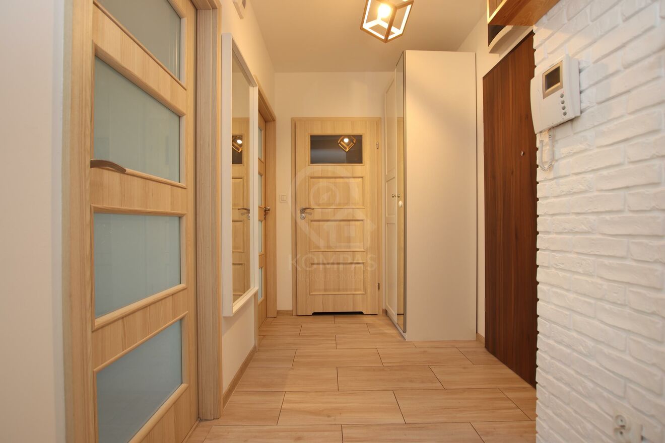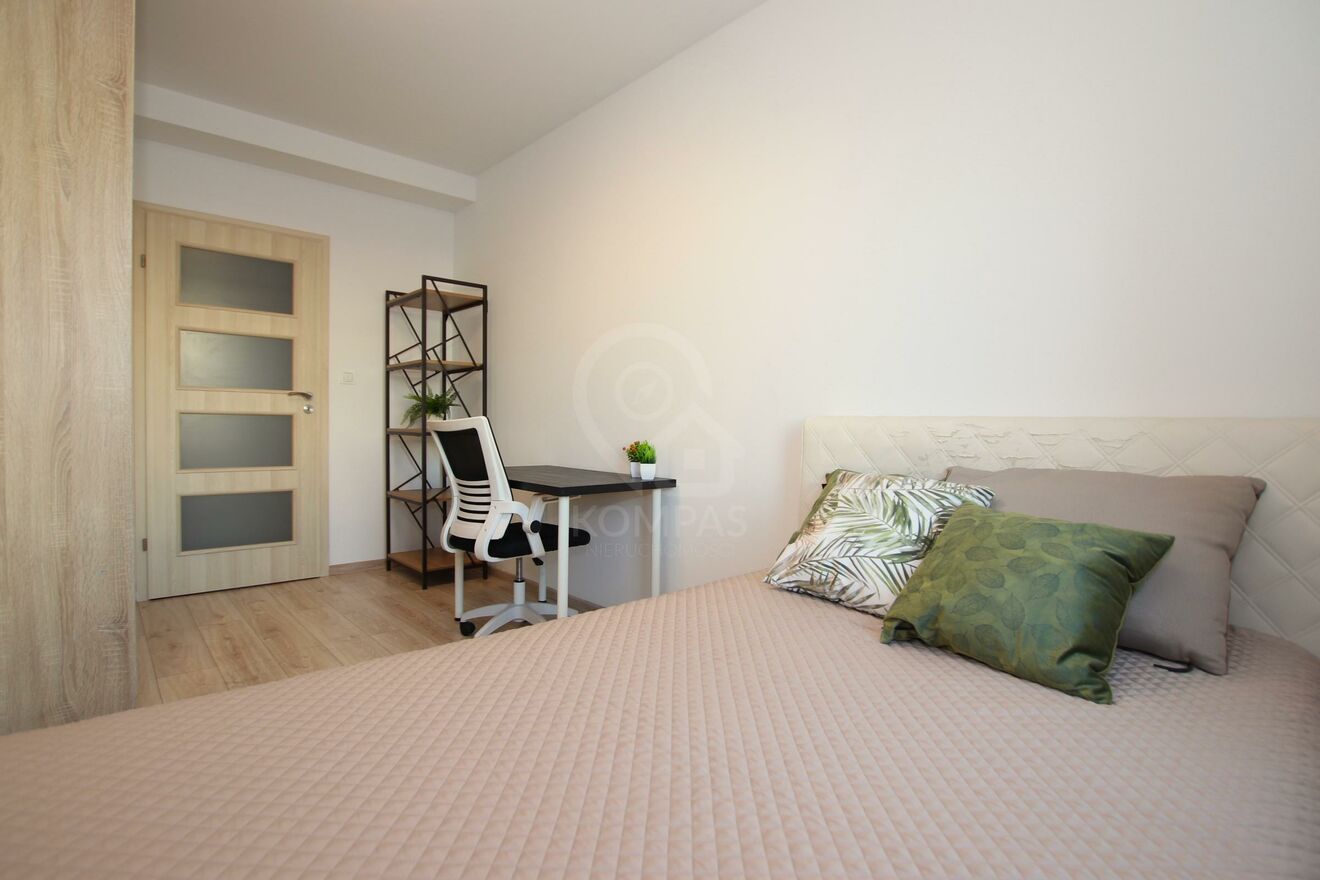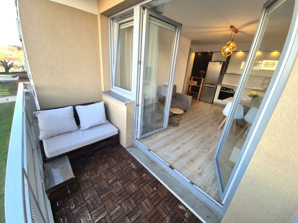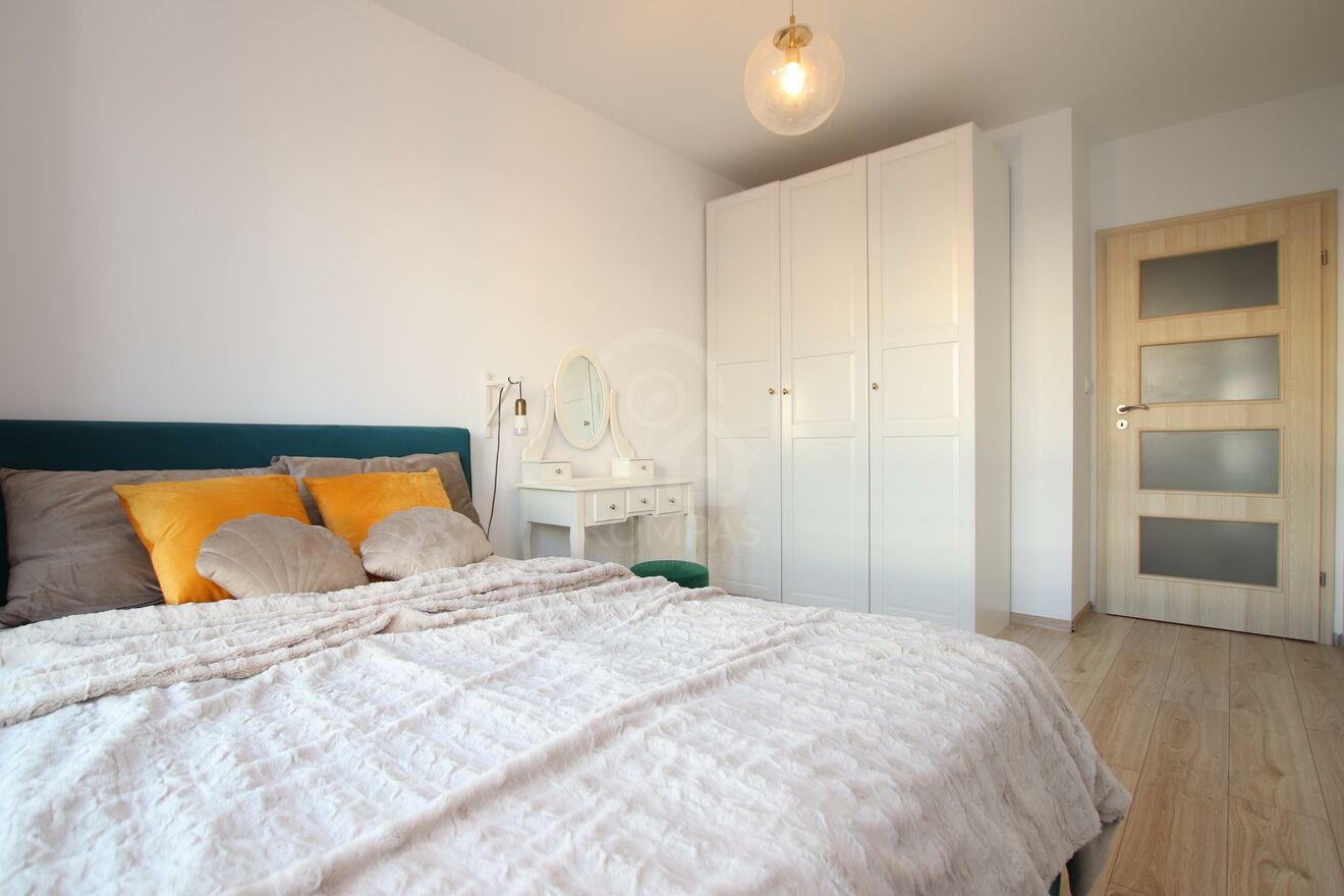 Mieszkanie urzeka wyjątkową aranżacją i dbałością o detale. Gustownie urządzone wnętrze harmonijnie łączy nowoczesny styl z funkcjonalnością. Otwarty salon z aneksem kuchennym sprzyja przestronności, a dwa niezależne pokoje zapewniają komfort i prywatność. Kuchnia z meblami na wymiar, doskonale współgrają z wysokiej klasy sprzętem AGD, tworząc elegancką i praktyczną przestrzeń. Panele o wysokiej klasie ścieralności (AC5), perfekcyjnie imitujące deskę, podkreślają nowoczesny charakter.