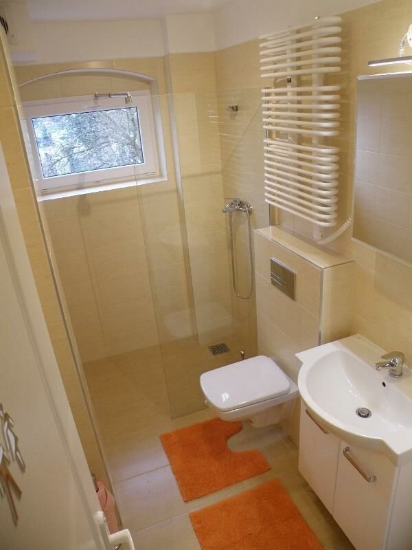 Łazienka z prysznicem, w.c. i umywalką.