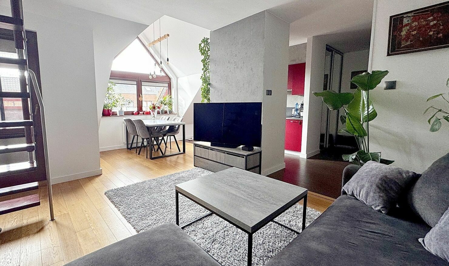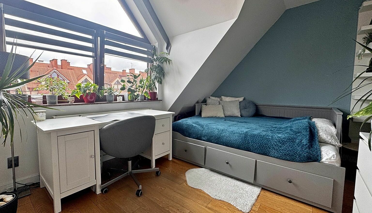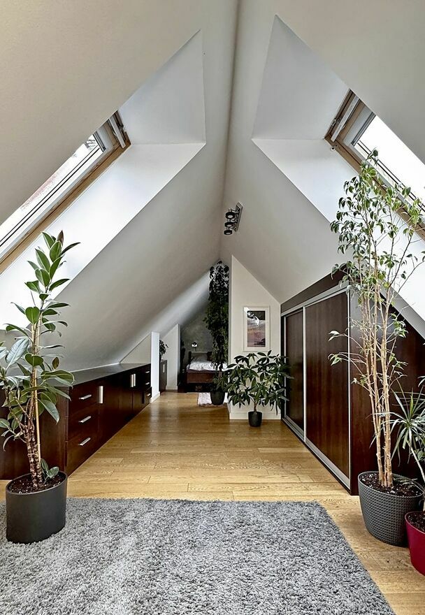 - Klimatyczne skosy i liczne okna dachowe, które wpuszczają mnóstwo naturalnego światła.