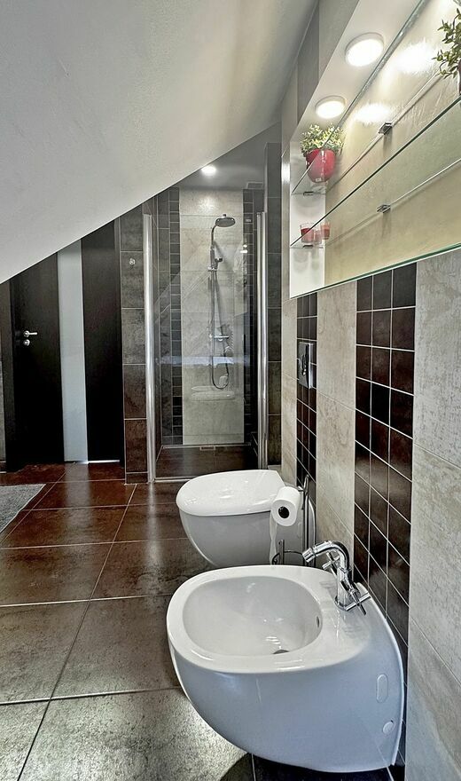 Prawdziwy pokój kąpielowy: Luksusowa, duża łazienka wykończona w eleganckich brązach i beżach. Do dyspozycji najemców jest zarówno narożna wanna (idealna do relaksu), jak i oddzielna kabina prysznicowa. W łazience znajduje się również WC, bidet oraz długa umywalka nablatowa z szafkami.