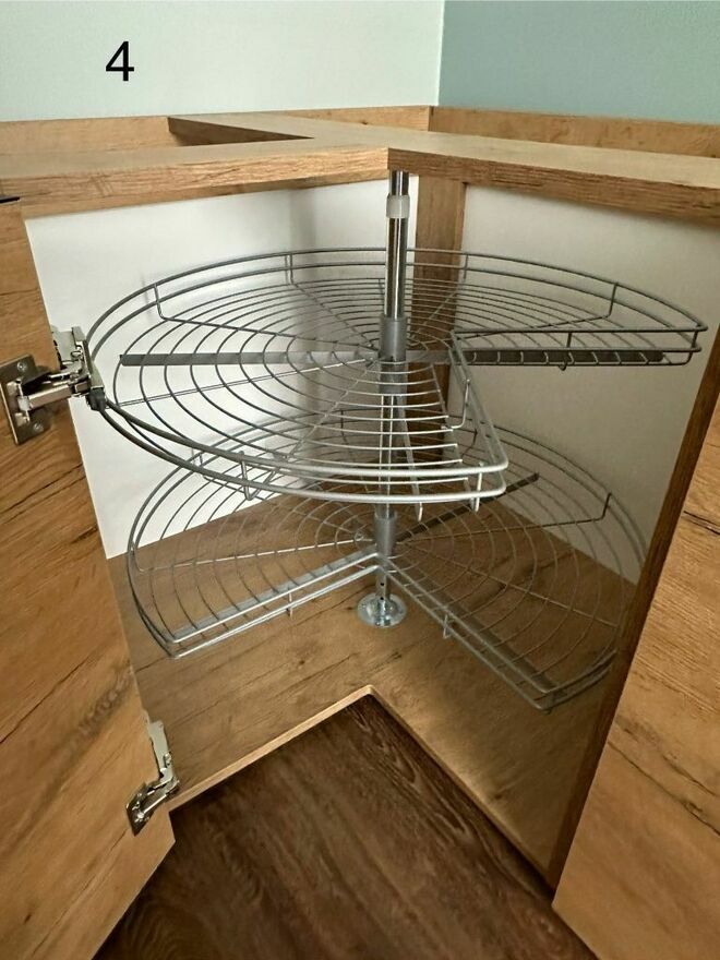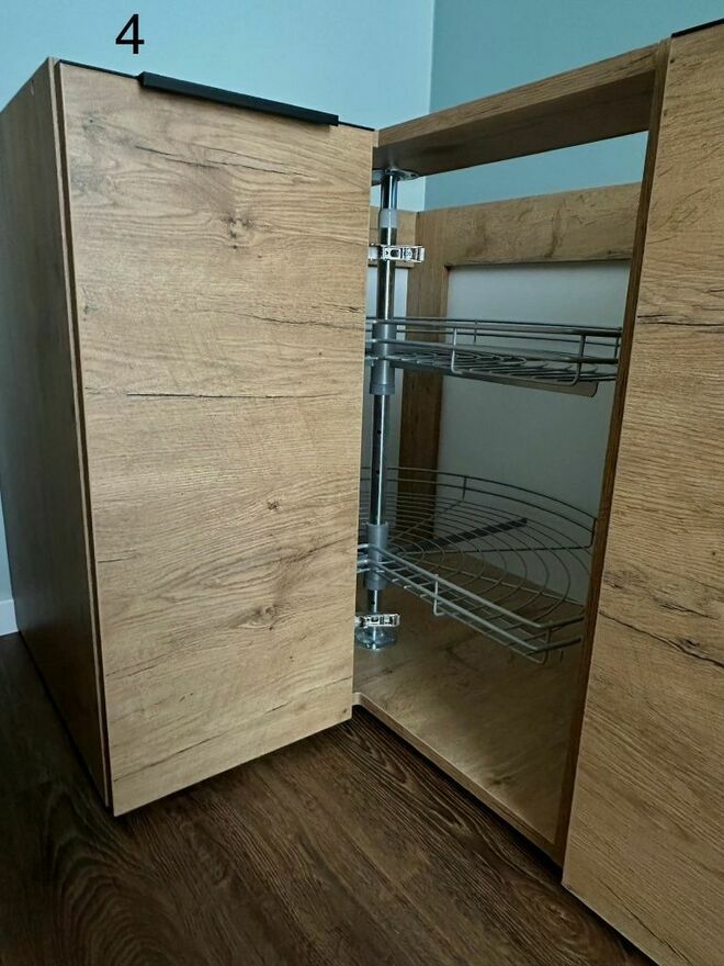 4) Szafkę narożną z koszem obrotowym – 85 cm x 85 cm