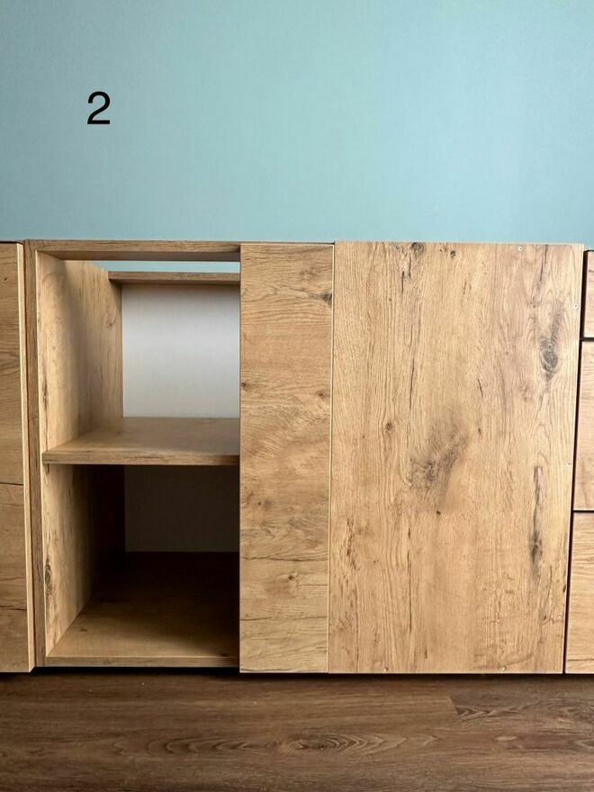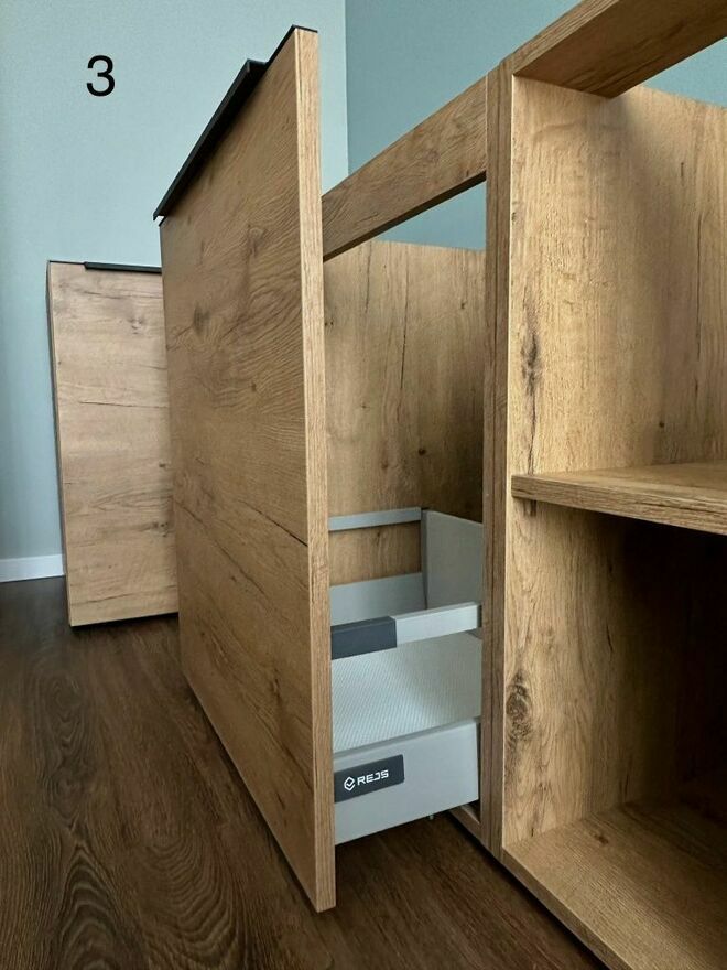 - brak frontu w szafce narożnej z półką (nr 2). Szafkę tą, w razie potrzeby, można w bardzo łatwy sposób przerobić na szafkę klasyczną (np. z 2 otwieranymi frontami)