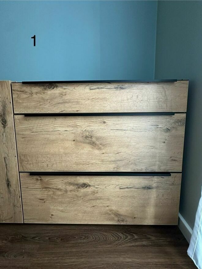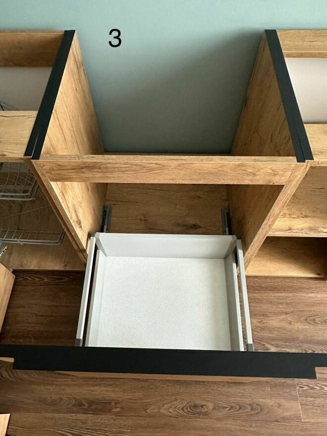 - brak jednego frontu w szafce narożnej z koszem (nr 4)