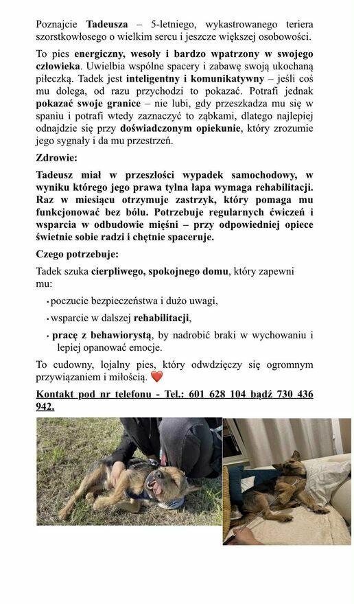 Tadziu to sympatyczny, pięcioletni pies, który szuka swojego kochającego domu. Ma za sobą trudniejsze doświadczenia, ale nadal bardzo ceni kontakt z człowiekiem. Lubi spacery, uwagę opiekuna i wspólne spędzanie czasu. Jest zaszczepiony, odrobaczony i zaczipowany. Warunkiem adopcji jest podpisanie umowy adopcyjnej.
