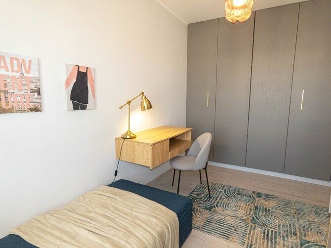 Pokój: komoda, łóżko, biurko, szafa w zabudowie.