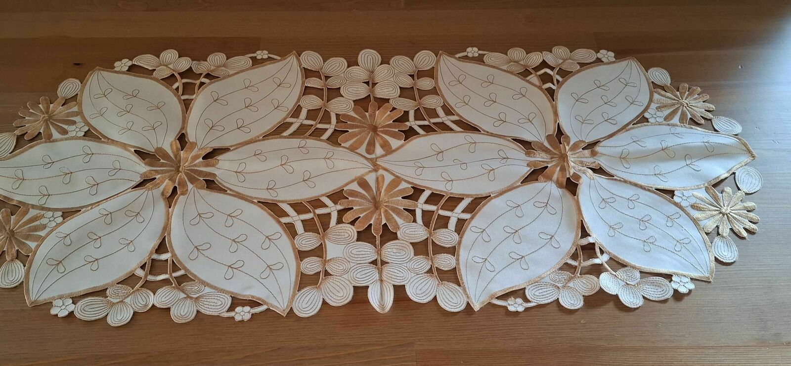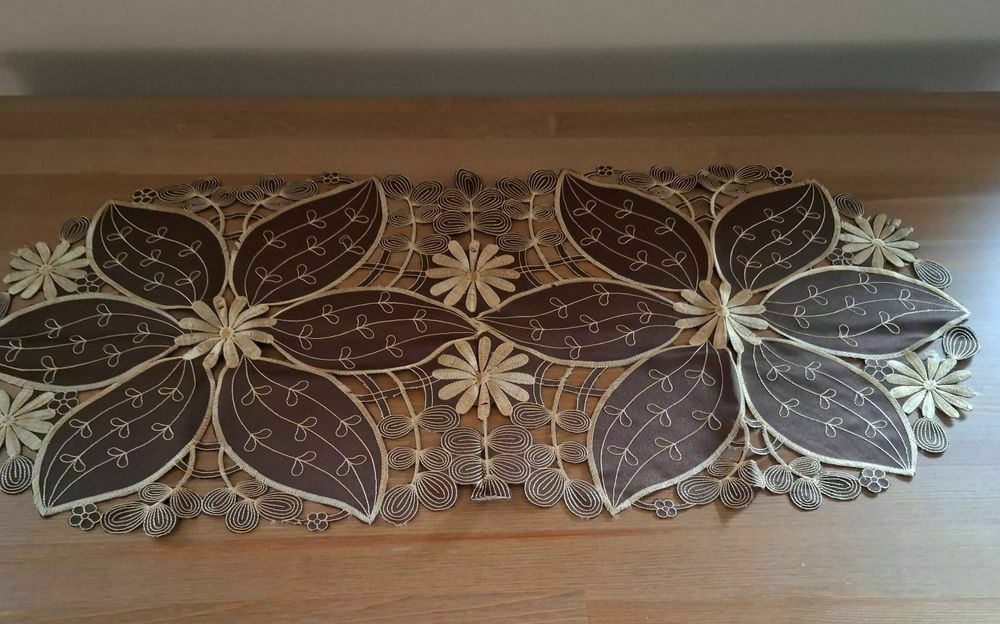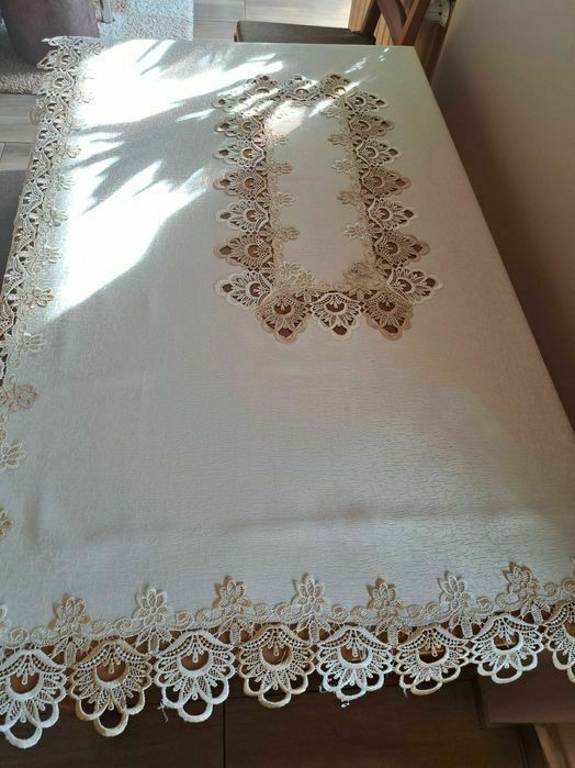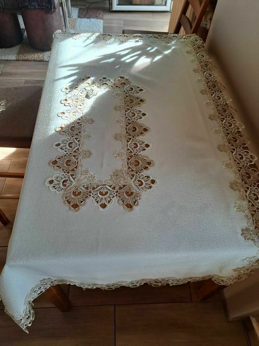 Sprzedam elegancki obrus w kolorze ecru, jasny brąz ( złoto ) o wymiarach 195cm x 100cm oraz Gratis serwety na ławę o wymiarach 88cm x 48cmSprawdź zainteresowanie tym ogłoszeniem