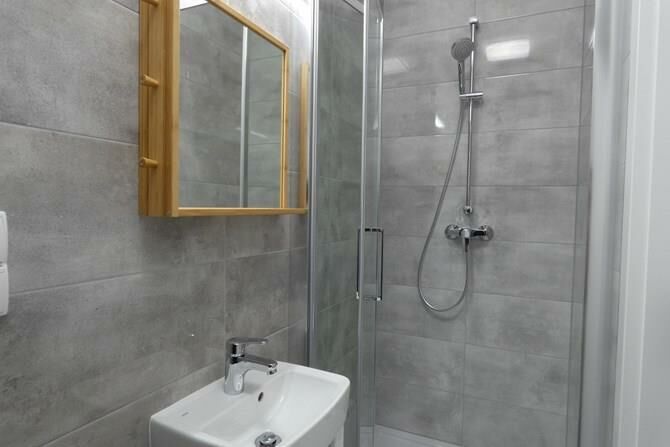 Łazienka: lustro z półką, prysznic, WC.