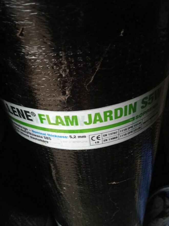 Odsprzedam papę nawierzchniową sopralene flam jardin. Antykorzenna, grubość 5mm. Jedna rolka=7m. Profesjonalny materiał o bardzo dobrych właściwościach. Cena za 1 rolkę. Posiadam 13 rolek. Możliwość transportu.Adam