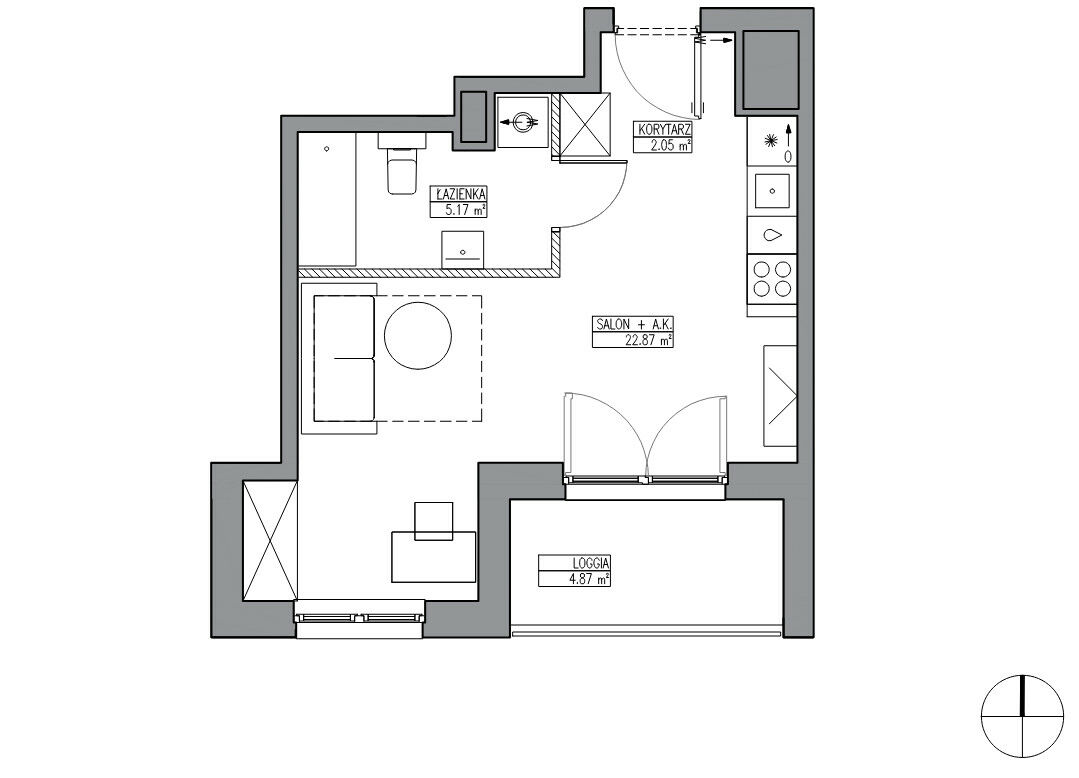 Prezentowane mieszkanie ma powierzchnię 30,08m2 i znajduje się na siódmym piętrze w 7 piętrowym budynku z windą, a jego główne cechy to - salon z aneksem kuchennym o powierzchni 22,87m2 z wyjściem na loggię o powierzchni 4,87m2, w salonie istnieje możliwość wydzielenia strefy nocnej oraz łazienka o powierzchni 5,17m2.