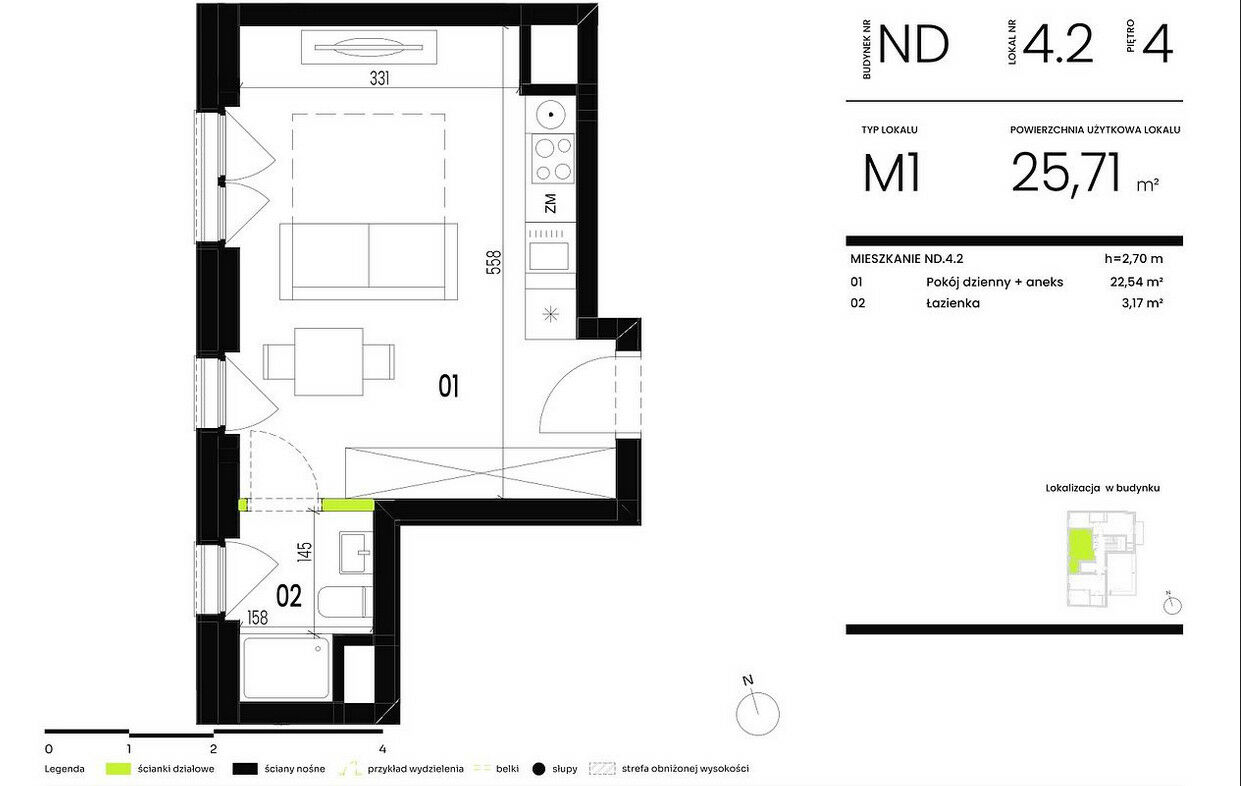 Zapraszam do zakupu wyjątkowych mieszkań w topowej lokalizacji. Inwestycja zlokalizowana jest w ścisłym centrum tętniącego życiem miasta, zaledwie 10 minut od Parku Staromiejskiego, 12 minut od wrocławskiego Rynku i 15 minut od Opery Wrocławskiej czy kilku znanych teatrów. Przemyślana architektura sprawia, że projekt doskonale wpisuje się w okoliczną tkankę miejską. Bliskość szkół, sklepów, restauracji, łatwy dostęp do rozbudowanej sieci transportu publicznego oraz szerokiej oferty kulturalnej Wrocławia sprawiają, że to idealna odpowiedź na potrzeby aktywnych wymagających mieszkańców Wrocławia. Projekt zakładający kompleksową rewitalizację dwóch zabytkowych kamienic w centrum miasta. Powstanie tu wielowymiarowa, innowacyjna przestrzeń miejska - ambitne przedsięwzięcie będące odpowiedzią na rosnące potrzeby współczesnego świata. Przez harmonijne połączenie nowoczesności z historią, projekt stanie się symbolem zupełnie nowego podejścia do miejskiego życia.Prezentowane mieszkanie ma powierzchnię 25,71m2 i znajduje się na czwartym piętrze w pięciokondygnacyjnym budynku a jego główne cechy to- salon z aneksem kuchennym o powierzchni 22,54m2, łazienka o powierzchni 3,17m2.