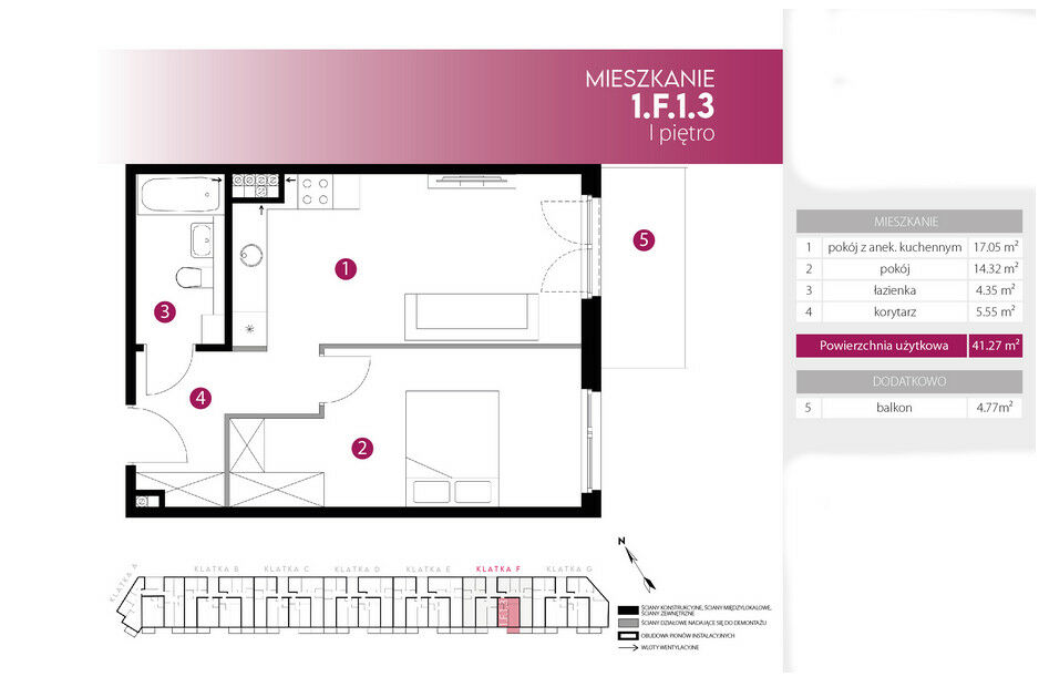 Kompleks składa się z pięciu nowoczesnych budynków, oferujących mieszkania o różnorodnych powierzchniach, od 37 m² do 103 m². W ofercie znajdują się funkcjonalne mieszkania dwupokojowe, przestronne trzypokojowe lokale oraz eleganckie czteropokojowe apartamenty. Dla osób poszukujących większej przestrzeni proponujemy także mieszkania dwupoziomowe z antresolą, które mają powierzchnię od 15 m² do 36 m². Każde mieszkanie w kompleksie ma dostęp do prywatnej przestrzeni zewnętrznej — balkonów lub ogrodów, idealnych do relaksu i spędzania czasu na świeżym powietrzu. Ogrody, przynależące do lokali na parterze, będą miały powierzchnię od 7 m² do 56 m², oferując mieszkańcom możliwość stworzenia wyjątkowej strefy wypoczynku w otoczeniu natury.Prezentowane mieszkanie ma powierzchnię 41,27m2 i znajduje się na pierwszym piętrze w czterokondygnacyjnego budynku a jego główne cechy to- salon z aneksem kuchennym o powierzchni 17,05m2 z wyjściem na balkon o powierzchni 4,77m, sypialnia o powierzchni 14,32m2, łazienka o powierzchni 4,35m2, przedpokój o powierzchni 5,55m2.