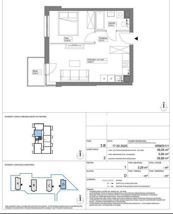 Prezentowane mieszkanie ma powierzchnię 39,05m2 i znajduje się na pierwszym piętrze w 5 piętrowym budynku a jego główne cechy to- salon z aneksem kuchennym o powierzchni 19,95m2 z wyjściem na balkon o powierzchni 3,29m2, sypialni 10,39m2 oraz łazienka o powierzchni 4,34m2.