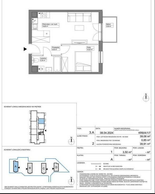 Prezentowane mieszkanie ma powierzchnię 39,06m2 i znajduje się na pierwszym piętrze w 5 piętrowym budynku a jego główne cechy to- salon z aneksem kuchennym o powierzchni 19,95m2 z wyjściem na balkon o powierzchni 3,50m2, sypialni 10,39m2 oraz łazienka o powierzchni 4,34m2.