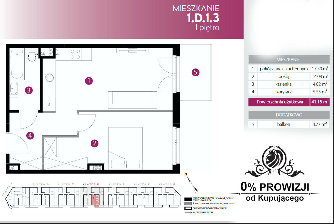 Kompleks składa się z pięciu nowoczesnych budynków, oferujących mieszkania o różnorodnych powierzchniach, od 37 m² do 103 m². W ofercie znajdują się funkcjonalne mieszkania dwupokojowe, przestronne trzypokojowe lokale oraz eleganckie czteropokojowe apartamenty. Dla osób poszukujących większej przestrzeni proponujemy także mieszkania dwupoziomowe z antresolą, które mają powierzchnię od 15 m² do 36 m². Każde mieszkanie w kompleksie ma dostęp do prywatnej przestrzeni zewnętrznej — balkonów lub ogrodów, idealnych do relaksu i spędzania czasu na świeżym powietrzu. Ogrody, przynależące do lokali na parterze, będą miały powierzchnię od 7 m² do 56 m², oferując mieszkańcom możliwość stworzenia wyjątkowej strefy wypoczynku w otoczeniu natury.Prezentowane mieszkanie ma powierzchnię 41,15m2 i znajduje się na pierwszym pietrze w czterokondygnacyjnym budynku a jego główne cechy to- salon o powierzchni 17,05m2 z wyjściem na balkon o powierzchni 4,77m, sypialnia o powierzchni 14,08m2. łazienka o powierzchni 4,02m2, korytarz o powierzchni 5,55m2.