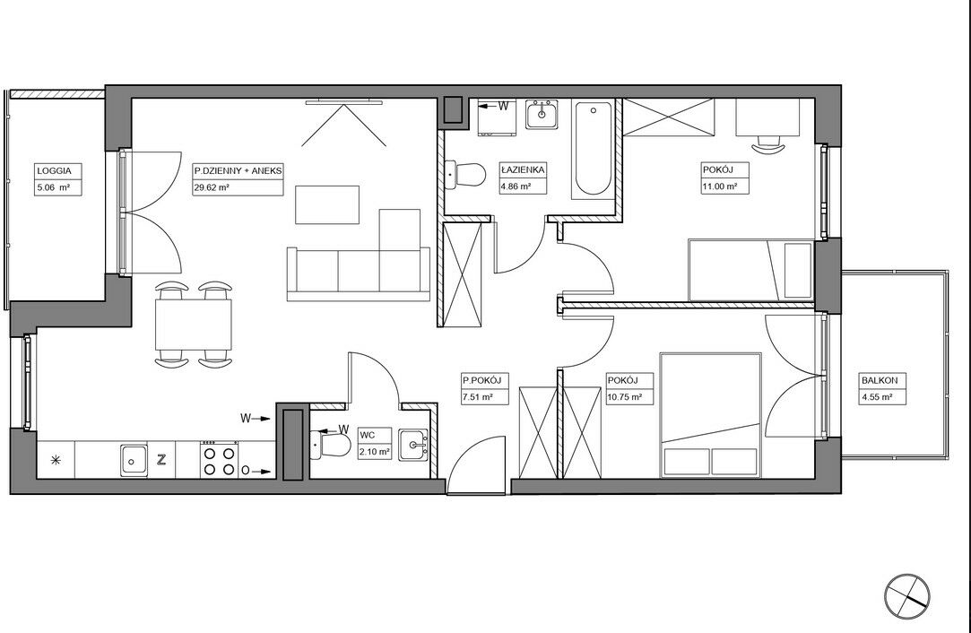 o wyjątkowe miejsce na wrocławskiej mapie nieruchomości, które idealnie łączy w sobie nowoczesność i wygodę. Młodych ludzi przyciąga tu zarówno doskonała komunikacja z centrum Wrocławia, jak i bliskość terenów rekreacyjnych oraz ścieżek rowerowych. To również wymarzona dzielnica dla rodzin z dziećmi, które odnajdą tu parki, sklepy, szkoły i miejsca rozrywki.-Prezentowane mieszkanie ma powierzchnię 65,84 m2 i znajduje się na pierwszym pietrze w 5 piętrowym budynku a jego główne cechy to- przestronny salon z aneksem kuchennym o powierzchni 29,62m2 z wyjściem na loggię o powierzchni 5,06m2, 2 sypialnie powierzchniach 11m2 i 10,75m2 z wyjściem na balkon o powierzchni 4,55m2, przedpokój o powierzchni 7,51m2 oraz łazienka o powierzchni 4,86m2 i toaleta o powierzchni 2,10m2.