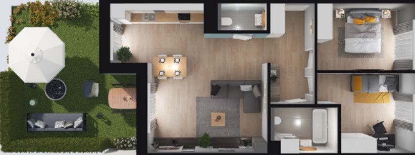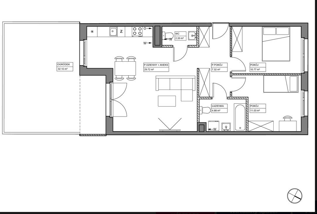 To wyjątkowe miejsce na wrocławskiej mapie nieruchomości, które idealnie łączy w sobie nowoczesność i wygodę. Młodych ludzi przyciąga tu zarówno doskonała komunikacja z centrum Wrocławia, jak i bliskość terenów rekreacyjnych oraz ścieżek rowerowych. To również wymarzona dzielnica dla rodzin z dziećmi, które odnajdą tu parki, sklepy, szkoły i miejsca rozrywki.-Prezentowane mieszkanie ma powierzchnię 65,92 m2 i znajduje się na parterze w 5 piętrowym budynku a jego główne cechy to- przestronny salon z aneksem kuchennym o powierzchni 29,72m2 z wyjściem na ogród o powierzchni 32,10m2, 2 sypialnie powierzchniach 11,03m2 i 10,77m2, przedpokój o powierzchni 7,32m2 oraz łazienka o powierzchni 4,88m2 i toaleta o powierzchni 2,2m2.