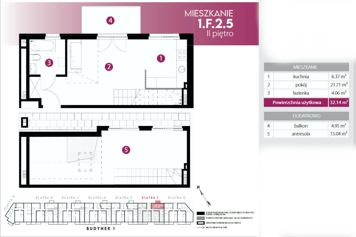 Kompleks składa się z pięciu nowoczesnych budynków, oferujących mieszkania o różnorodnych powierzchniach, od 37 m² do 103 m². W ofercie znajdują się funkcjonalne mieszkania dwupokojowe, przestronne trzypokojowe lokale oraz eleganckie czteropokojowe apartamenty. Dla osób poszukujących większej przestrzeni proponujemy także mieszkania dwupoziomowe z antresolą, które mają powierzchnię od 15 m² do 36 m². Każde mieszkanie w kompleksie ma dostęp do prywatnej przestrzeni zewnętrznej — balkonów lub ogrodów, idealnych do relaksu i spędzania czasu na świeżym powietrzu. Ogrody, przynależące do lokali na parterze, będą miały powierzchnię od 7 m² do 56 m², oferując mieszkańcom możliwość stworzenia wyjątkowej strefy wypoczynku w otoczeniu natury.Prezentowane mieszkanie ma powierzchnię 47,18m2 i znajduje się na drugim pietrze w czterokondygnacyjm budynku a jego główne cechy to- salon o powierzchni 21,71m2 z wyjściem na balkon o powierzchni 4,95m2, osobna kuchnia o powierzchni 6,37m2, łazienka o powierzchni 4,06m2, na drugim poziomie znajdziemy antresolę o powierzchni 15,04, na której możemy zaaranżować sypialnię oraz łazienkę ( wszystkie przyłącza są wyprowadzone w szachcie na poziomie antresoli).