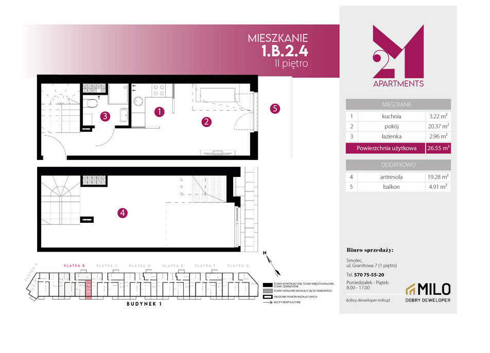 Kompleks składa się z pięciu nowoczesnych budynków, oferujących mieszkania o różnorodnych powierzchniach, od 37 m² do 103 m². W ofercie znajdują się funkcjonalne mieszkania dwupokojowe, przestronne trzypokojowe lokale oraz eleganckie czteropokojowe apartamenty. Dla osób poszukujących większej przestrzeni proponujemy także mieszkania dwupoziomowe z antresolą, które mają powierzchnię od 15 m² do 36 m². Każde mieszkanie w kompleksie ma dostęp do prywatnej przestrzeni zewnętrznej — balkonów lub ogrodów, idealnych do relaksu i spędzania czasu na świeżym powietrzu. Ogrody, przynależące do lokali na parterze, będą miały powierzchnię od 7 m² do 56 m², oferując mieszkańcom możliwość stworzenia wyjątkowej strefy wypoczynku w otoczeniu natury.Prezentowane mieszkanie ma powierzchnię 45,83m2 i znajduje się na drugim pietrze w czterokondygnacyjm budynku a jego główne cechy to- salon o powierzchni 20,37m2 z wyjściem na balkon o powierzchni 4,91m2, osobna kuchnia o powierzchni 3,92m2, łazienka o powierzchni 2,96m2. na drugim poziomie znajdziemy antresolę o powierzchni 19,21, na której możemy zaaranżować sypialnię oraz łazienkę ( wszystkie przyłącza są wyprowadzone w szachcie na poziomie antresoli).