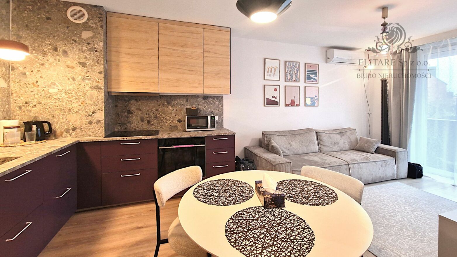 WYPOSAŻENIE: klimatyzacja, nowoczesne, wykonane na wymiar meble kuchenne wraz ze sprzętem AGD ( lodówka, zmywarka (Electrolux),pralka (Amica), płyta indukcyjna (Beko), piekarnik (Whirlpool), pochłaniacz, stół z krzesłami, wszystkie zabudowy wykonane na wymiar, kanapa, łóżko, gustownie wyposażona łazienka.